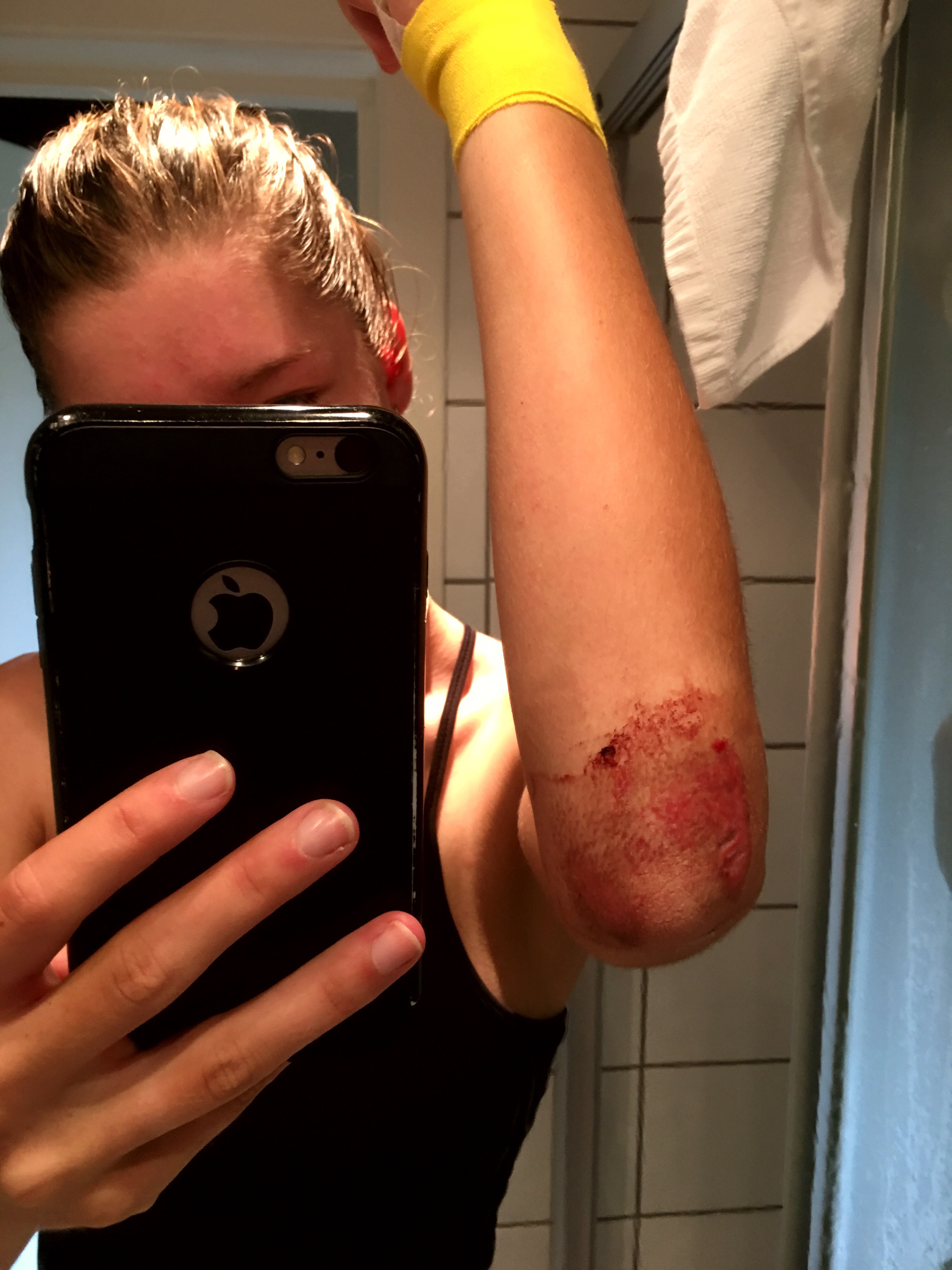 We lagen erg dicht bij het parcours. Na een lange reis gingen we direct al de proloog verkennen. Ik zag al snel dat het mij wel lag. Veel en lastige bochten, daar kon het verschil gemaakt worden. Op de dag zelf gingen we nog een aantal keer het parcours verkennen, deze keer wat harder omdat het geheel afgezet was. Een kwartier voordat de eerste startte verkende ik mijn laatste rondje. Helaas… ik reed op een recht stuk, viaduct omlaag en had de snelheid dus aardig erin zitten toen ik naar een keerpunt toe reed om deze bocht te testen. Ik remde een beetje maar dit ging helemaal fout. Mijn voorrem blokkeerde en ik vloog er voorover af. Reageren was geen optie omdat je het verre van ziet aankomen. Hierdoor maakte ik een flinke klap. Ik was meer in shock dan dat ik pijn had in eerste instantie. Ik wilde mijn fiets weer op om zo later de proloog te kunnen starten maar al snel merkte ik dat het niet zo lekker voelde. Ik kon niet remmen zonder pijn. Liggen was ook geen optie vanwege mijn afgeschaafde elleboog. Ik heb besloten de proloog op mijn gewone fiets te starten om dan die volgende dag te bepalen of ik door wil of niet. In de avond van de proloog ben ik nog naar het ziekenhuis geweest. Kleine scheurtjes zagen ze in mijn pols maar geen hele breuken gelukkig. Dit betekend dan ook dat ik wel mag fietsen maar in eerste instantie zonder druk. In de ochtend werd ik wakker en toen wist ik eigenlijk al genoeg, de pijn was erger en ook mijn pols voelde niet lekker aan. Alsnog ben ik een uurtje gaan proberen om te fietsen of het echt niet ging. Besloten na dit uurtje om een einde te maken aan deze meerdaagse. Ik hoop dat ik optijd klaar ben en dat alles optijd genezen is voor de Boels Ladies Tour. Nu twee dagen verder laat ik nog steeds de wonden drogen en doe ik vrij weinig. Met de hoop dat ik zo snel mogelijk weer echt kan trainen!