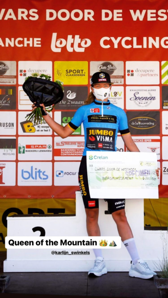 Zondag was er een nieuwe dag met nieuwe kansen en zo ging ik ook de koers in. Anna was na de neutralisatie afgestapt, omdat ze te veel last had van haar verwondingen. Voor de rest stond er nog een zware wedstrijd te wachten. Na ongeveer 30 kilometer nam team SD Worx de leiding over de koers en besloot het peloton op een lint te trekken. Majerus van SD Worx reed weg en ik kreeg het gat nog maar net gedicht met vier andere rensters in mijn wiel. De samenwerking was gelijk goed en daardoor hebben we zo’n 70 kilometer samen gereden. Na deze 70 kilometer moesten twee rensters lossen, dus waren we nog maar met vier rensters over. Ondertussen wist ik punten te verdienen op verschillende klimmen en behaalde daarmee de blauwe trui. De blauwe trui was voor de ‘queen of the mountain’. De samenwerking was nog steeds goed, maar jammer genoeg werden we met ongeveer 5 kilometer voor de finish teruggepakt. Je moet een beetje geluk hebben om weg te blijven met een kopgroep. Op een dag gaat de ontsnapping wegblijven, hopelijk zit ik daar dan ook bij. Gelukkig had Jip nog goede sprintersbenen en pakte daarmee een mooie 5e plek.